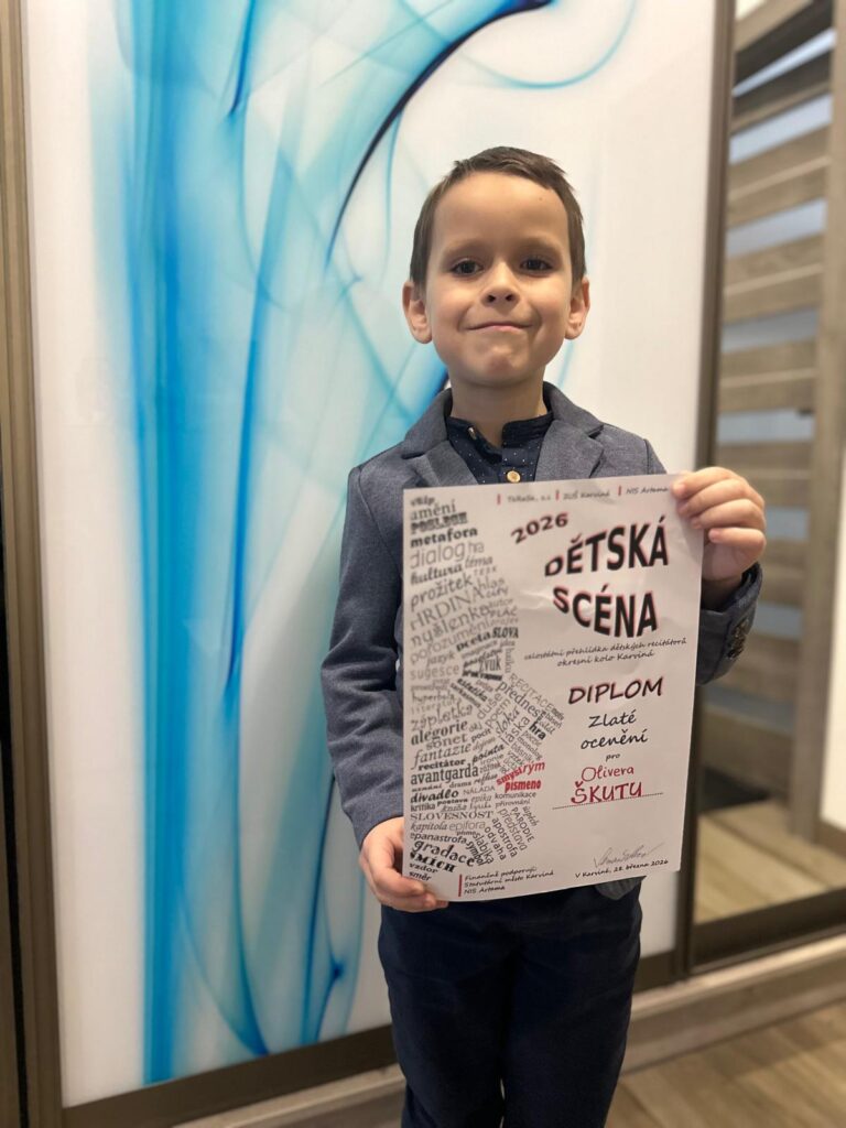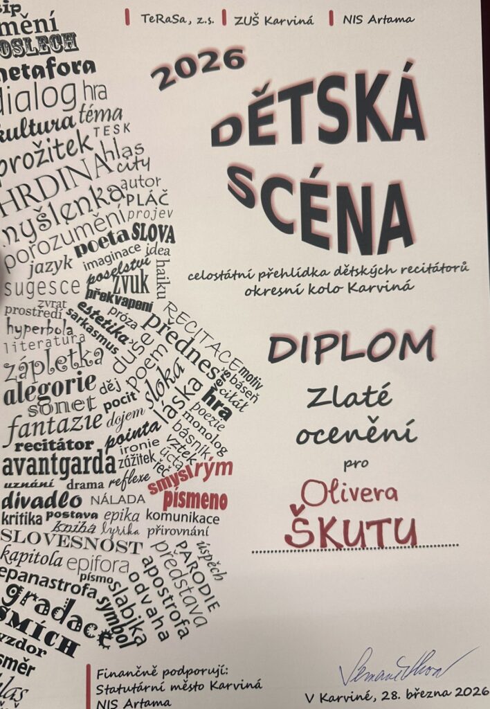Dne 28. března 2026 se v ZUŠ Karviná konalo okresní kolo recitační soutěže Dětská scéna. Naši školu zde v 0. kategorii reprezentoval Oliver Škuta ze třídy p. uč. Lukáše Moravce, který svým výkonem zaujal odbornou porotu a získal zlaté pásmo s postupem do krajského kola. Oliverovi srdečně gratulujeme, děkujeme za skvělou reprezentaci školy a přejeme mu hodně úspěchů v dalším kole soutěže.